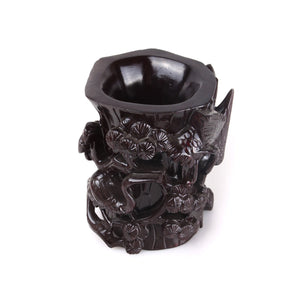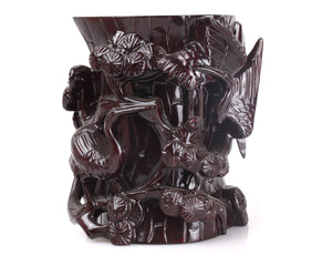 The Dancing Crane Brush Holder is one of the most ornate and exquisitely carved brush holders we offer here at The Chinese Calligraphist. With a core that is carved like a tree trunk, two cranes protrude from this cylinder and seem to actually fly around it. In fact, the cranes are dancing with each other, and also are surrounded by an array of blooms, also extending beyond the trunk.