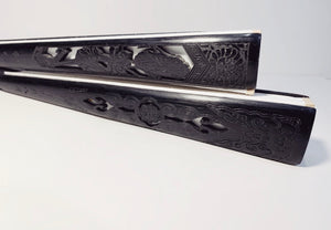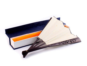 Create a beautiful and special artwork on a traditional Chinese hand fan. This fan is disassembled so that you can produce an unusual Sumi-painting or calligraphy artwork on the sized xuan paper decorated with gold speckles. The handle is made of dark wood and hand carved with a traditional Oriental flower pattern. Note: the carving pattern can vary between different Chinese traditional themes